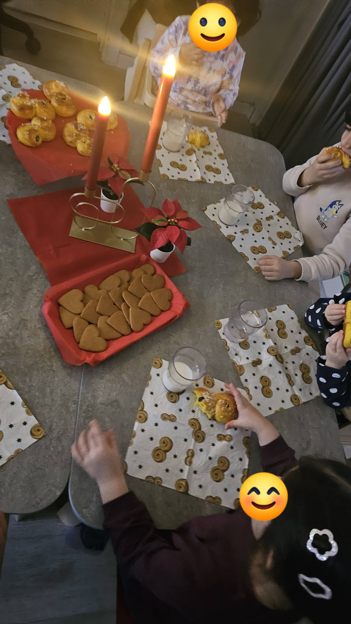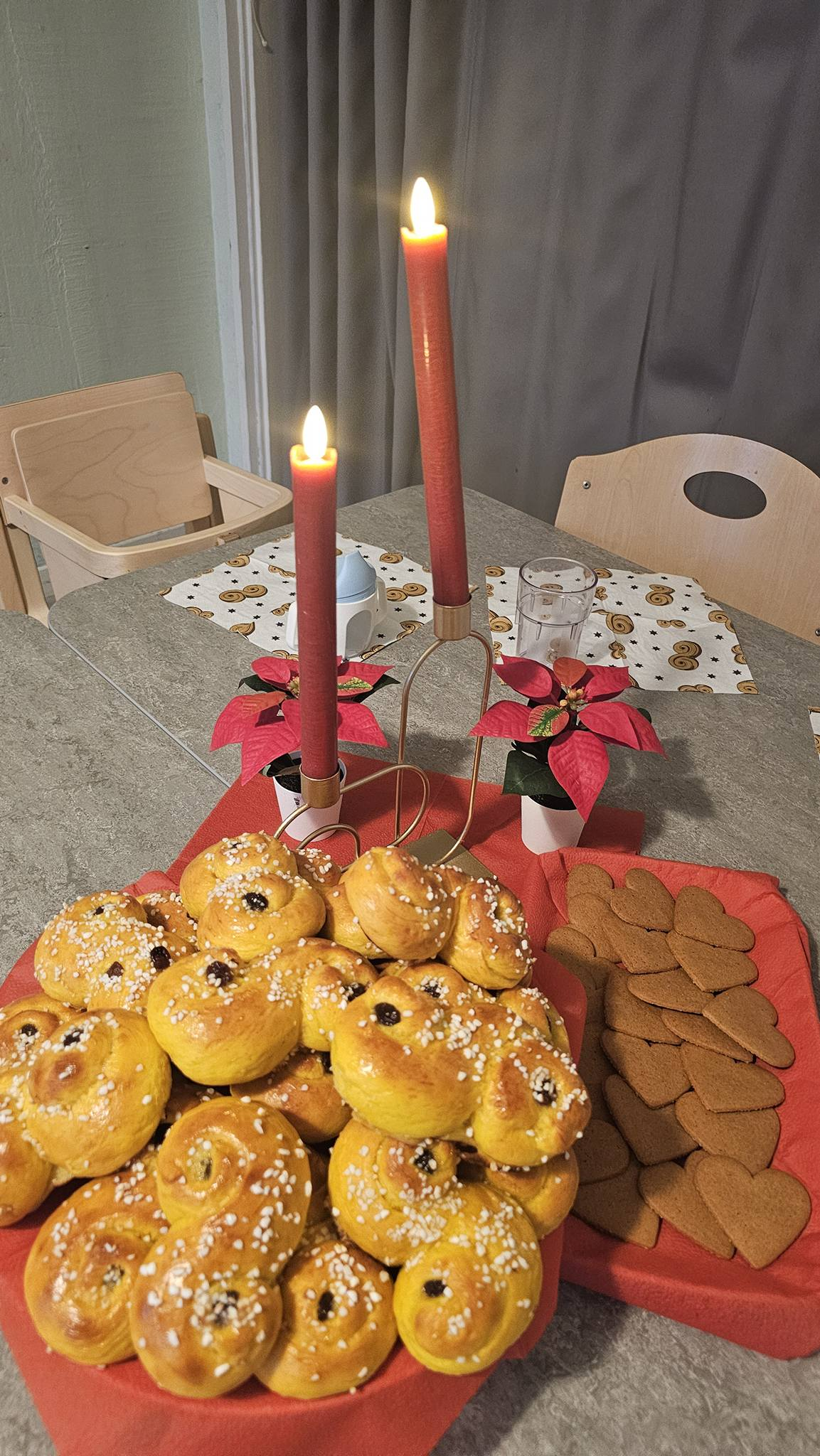 Vi har dessutom haft flera mysiga stunder tillsammans. Vi bakade lussebullar som vi sedan åt medan vi tittade på en kort, barnanpassad film om vem Lucia var. Dagarna har fyllts med mycket pyssel och kreativa aktiviteter, julsånger och bokläsning. Vi har även haft mycket glädje och rörelse då barnen dansade till dansstopp och körde breakdans en och en (för de som ville). Vissa passade även på att sjunga i mikrofon, vilket var jättekul!