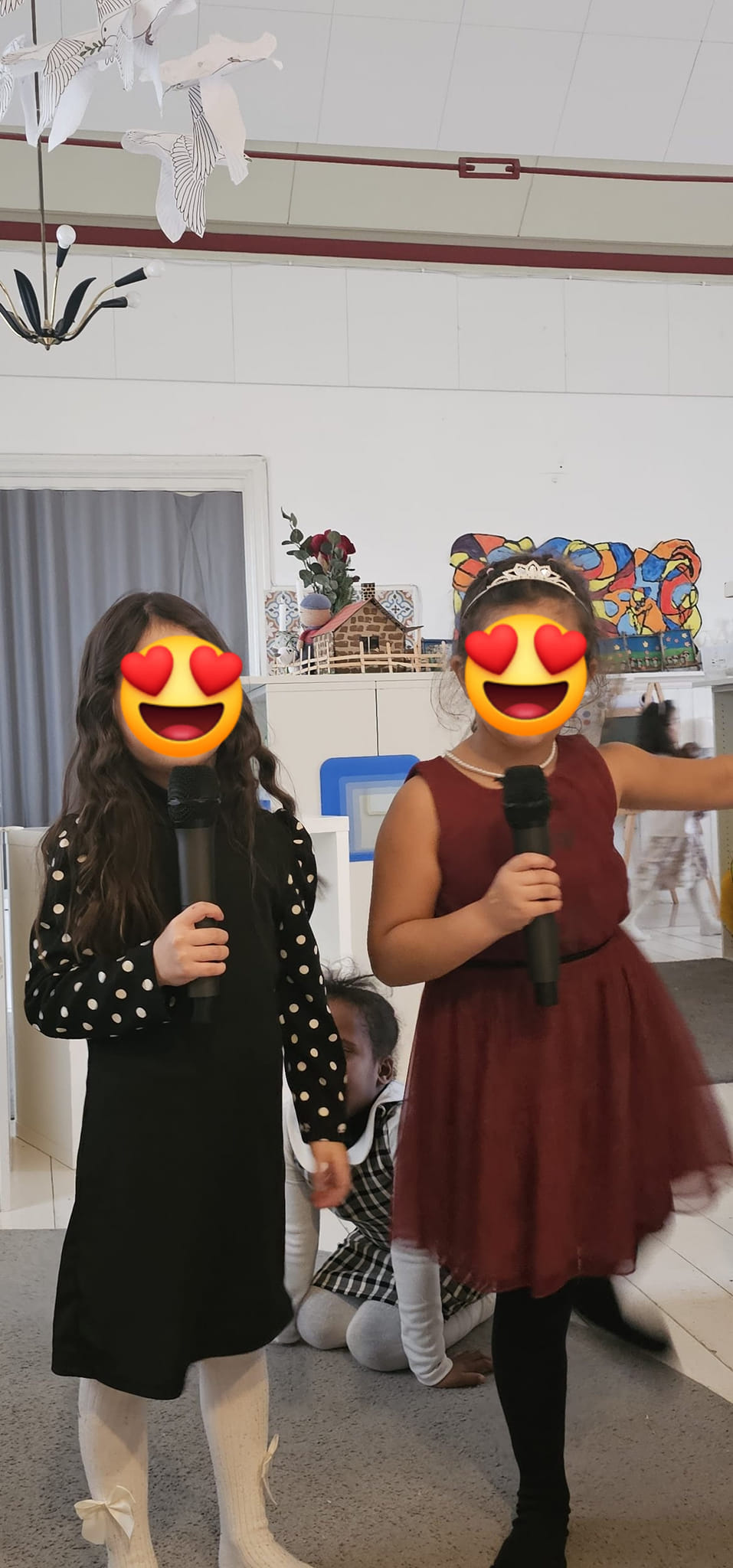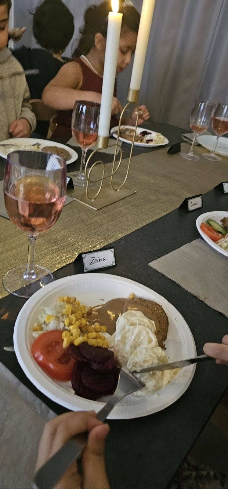 Vi avslutade vår fest med mycket dans och sång, och barnen försökte sig på att dansa till vacker valsmusik. Efter alla dessa aktiviteter var det dags för en välsmakande trerätters lunch som väntade på oss. Barnen satte sig vid borden, som var vackert dukade. Bordslöparna i glänsande guldfärg räckte längs borden, de fina ljusstakarna, prydde varje bord och gav en festlig stämning. Varje plats var noggrant utvald med bordsplaceringsskyltar och stiliga vinglas stod och var redo att fyllas med saft. Det var en dukning som inte bara lovade en fantastisk lunch, utan också en upplevelse av gemenskap och glädje. Medan vi njöt av vår goda lunch spelade Bachs klassiska musik i bakgrunden.