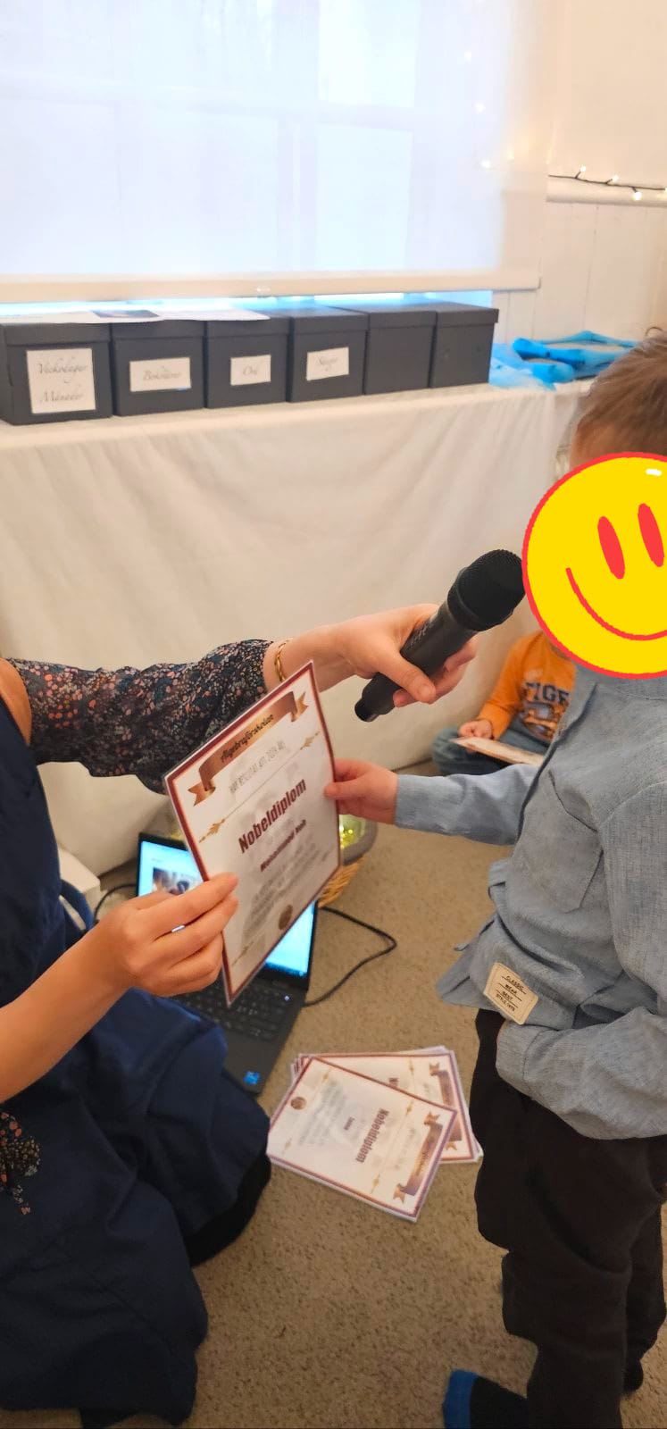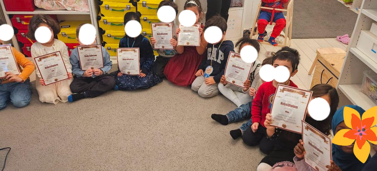 När vi var klara med våra experiment satte alla barnen i en stor ring. Det var dags för något alldeles speciellt, utdelningen av diplom och medaljer! Barnens ansikten strålade av stolthet när de mottog sina utmärkelser. Det var tydligt att de kände sig uppskattade och unika, klädda i sina finaste kläder, vilket gjorde stunden ännu mer minnesvärd.