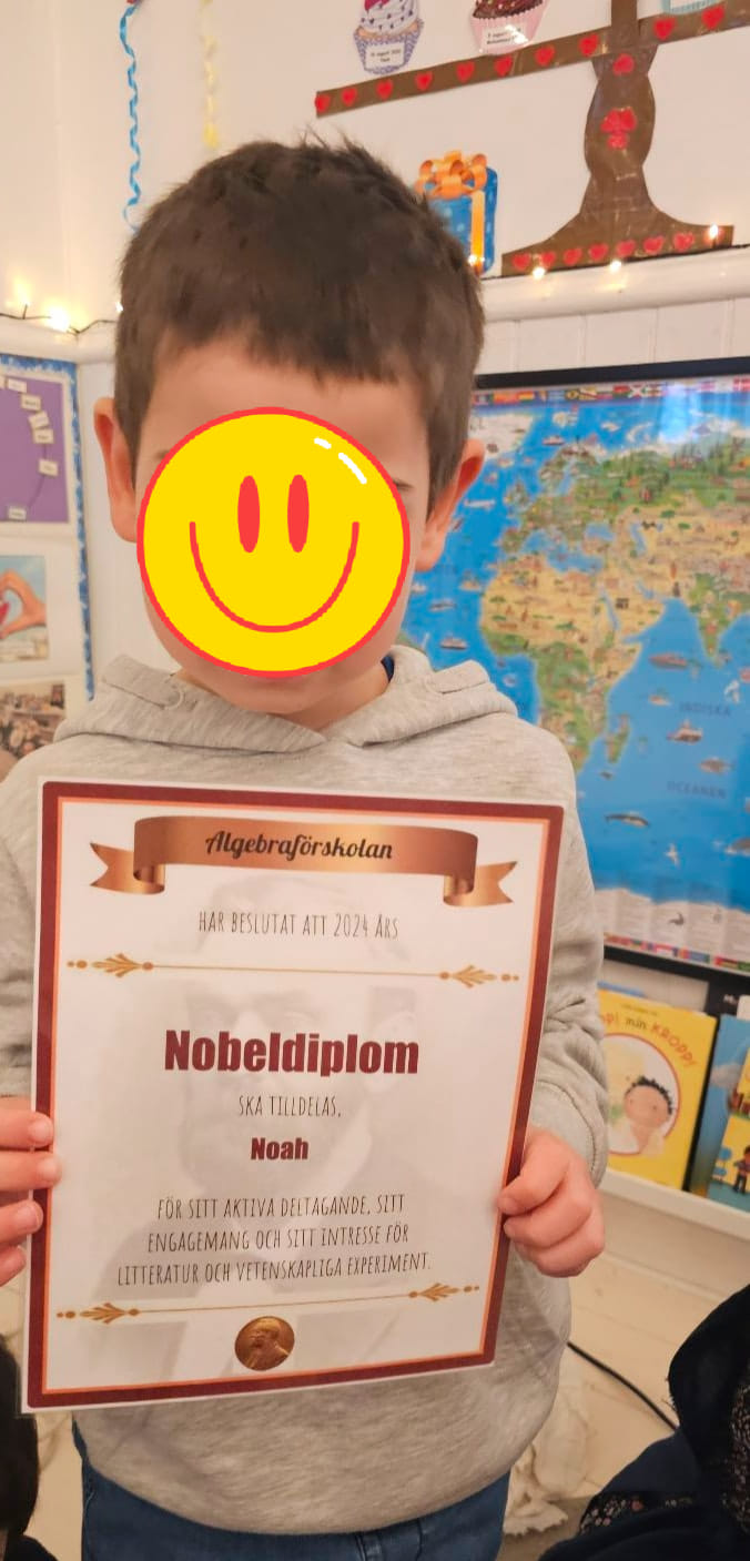 Under hela förra veckan har vi pratat om Alfred Nobels liv och uppfinningar, Nobellunchen och Nobelprisen. Vi tittade även på tidigare Nobelfester, vilket inspirerade barnen och fick dem att längta efter vår egen lilla Nobelfest. Idag samlades vi för att fira en av årets mest efterlängtade dagar. Vi inledde med en gemensam samling där vi såg filmen ”Nobeldagen”, som visade vad denna speciella dag verkligen innebär.