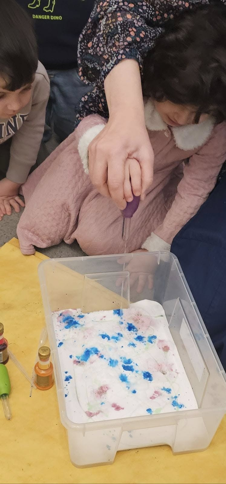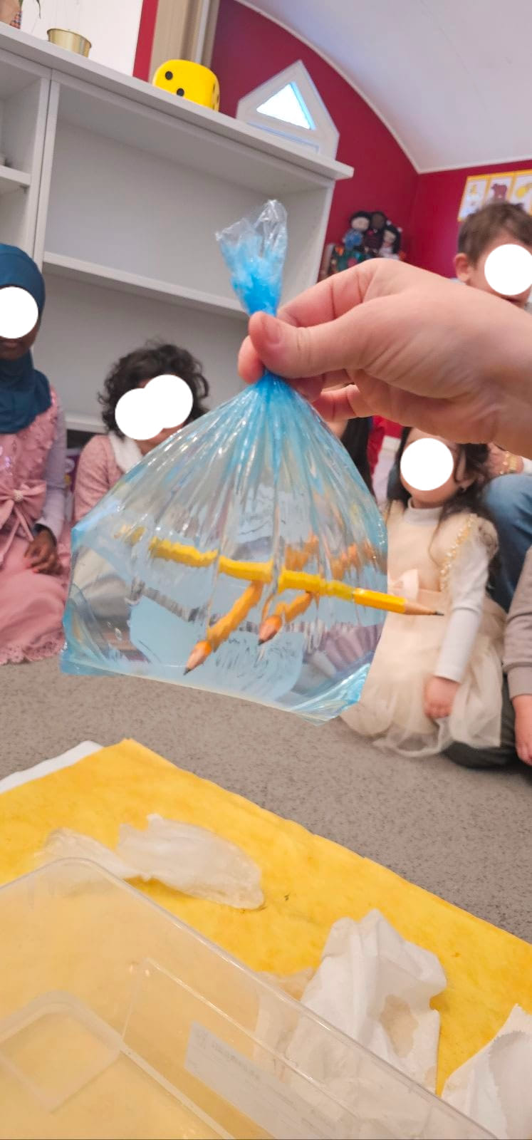 Efter det fick vi genomföra två experiment. Det första handlade om att sticka pennor rakt igenom en påse fylld med vatten utan att det läckte. Det andra demonstrerade vad som händer när man droppar ättika på bikarbonat. Dessa experiment var både spännande och fascinerande, och de fångade verkligen barnens intresse och gjorde dem häpna.