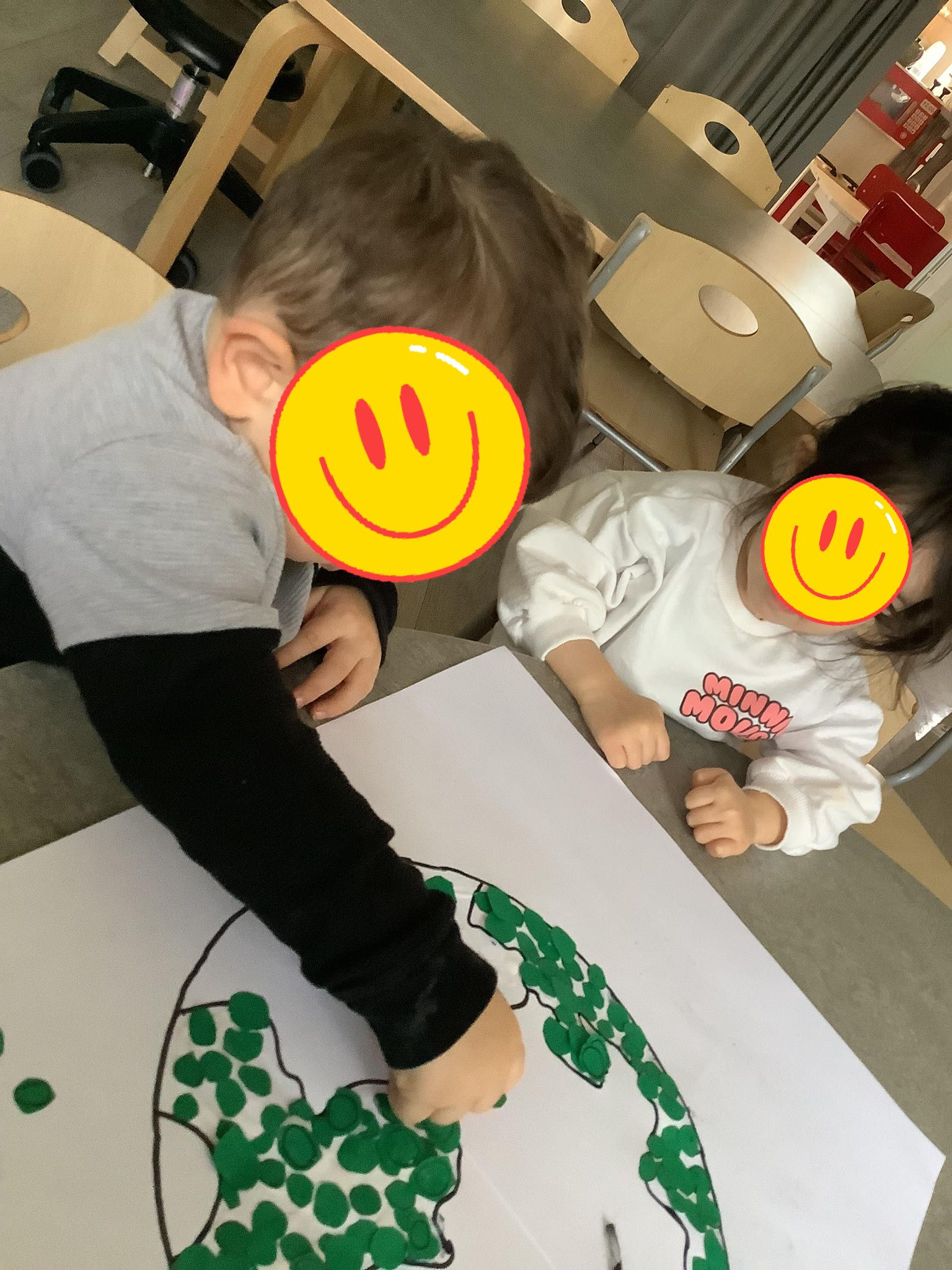 Vi har sett korta filmer som ger en inblick i hur livet ser ut i andra delar av världen. De äldsta barnen har målat flaggor från de länder som är presenterade i barngruppen, och dessa har dekorerat en enorm fredsduva som vi klippt ut på ett stort ark. Dessutom har de skapat en mobil med mindre fredsduvor som vi har hängt upp som en häftig dekoration. De yngsta barnen har å sin sida skapat en tavla med jordklotet i centrum, omgiven av barnens handavtryck – en symbol för gemenskap och lika rättigheter. Genom att använda olika färger fick barnen uppleva att de får göra egna val och att det är helt okej att tycka olika. .