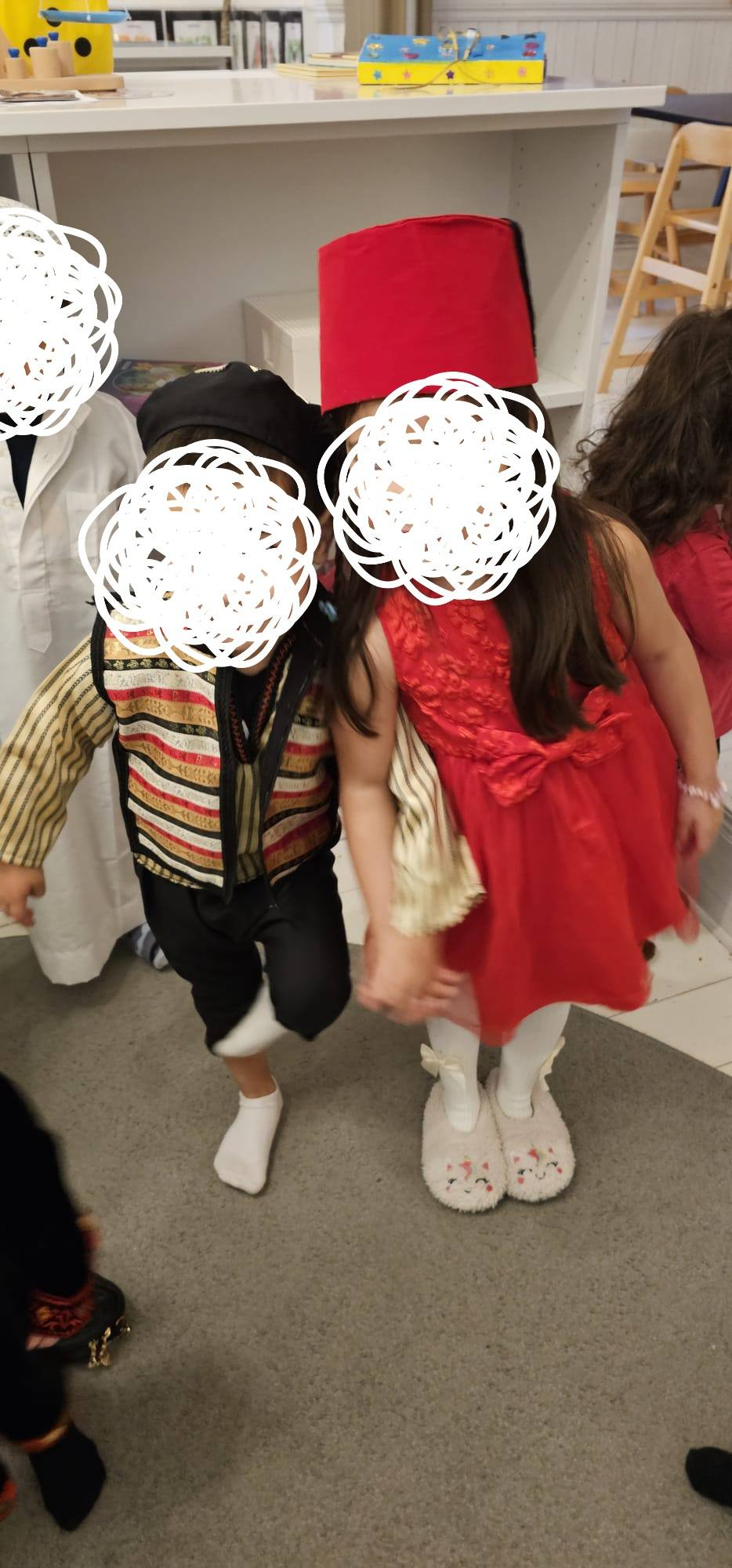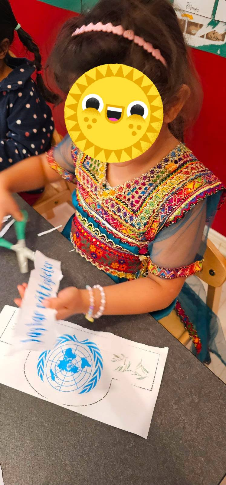På FN-dagen hade vi en gemensam samling där vi lyssnade och sjöng sånger med teman kring fred och trygghet. Vi njöt även av några folkdanser från barnens hemländer, vilket gjorde stunden ännu mer festlig. Några fröknar och flera av barnen hade på sig kläder som påminde om sina ursprungsländer. Andra hade med sig olika föremål och saker som de köpt i sina hemländer. Två barn valde dessutom att bjuda oss på maträtter som är typiska för sina kulturer.