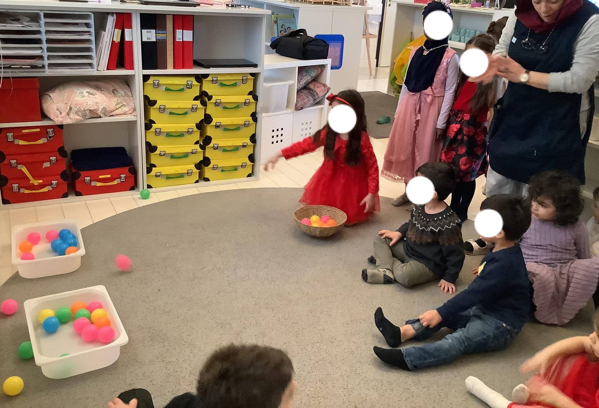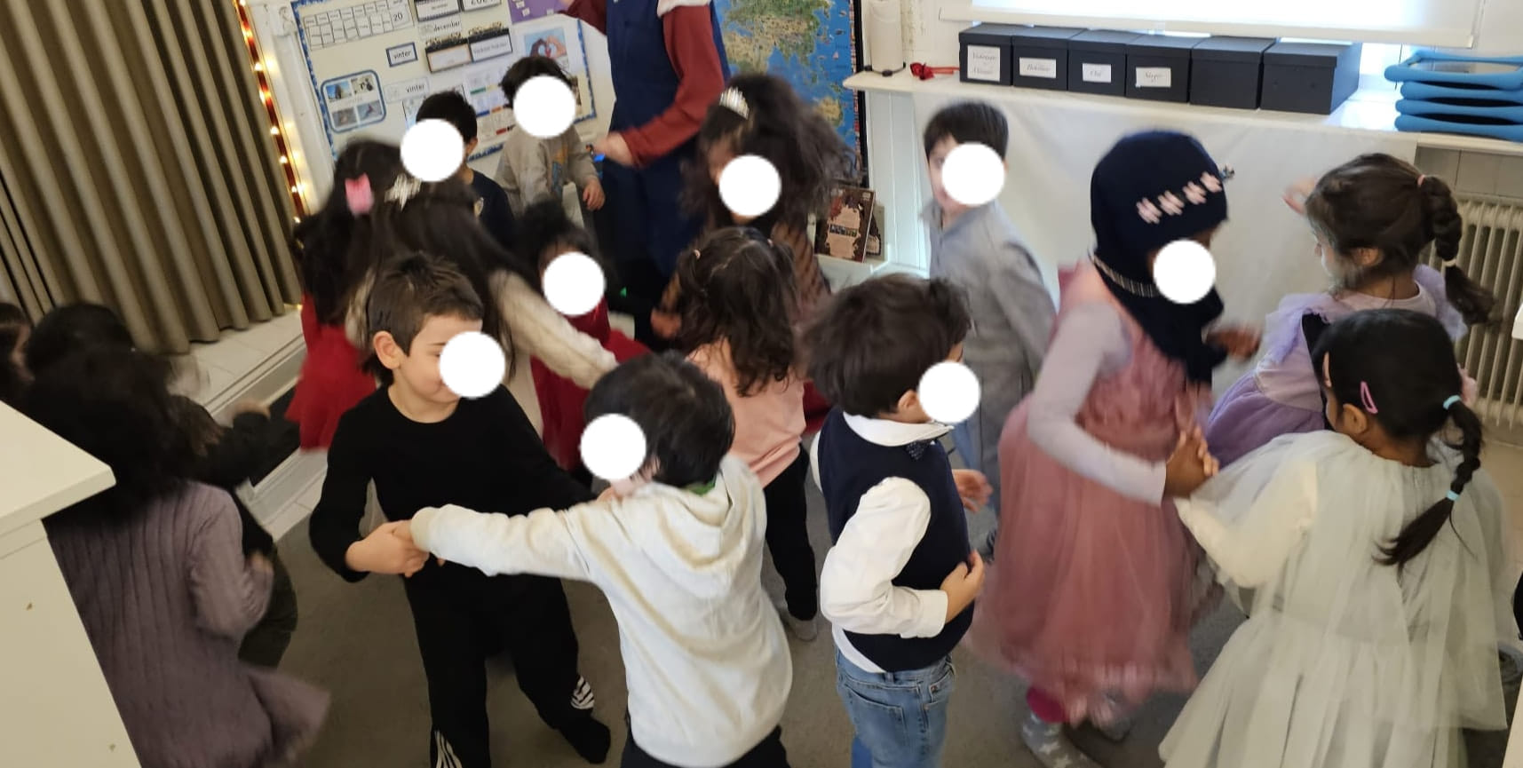 Vi började med att lyssna på boken ”Tomten i trubbel” ur Polyglutt. Berättelsen fångade barnens intresse, och snart var vi alla med i tomtens äventyr. Sedan blev det dans, och barnen fick turas om att dansa breakdance med stor entusiasm. Skratten och glädjen fyllde rummet när de visade upp sina bästa rörelser. Efter dansen var det dags för något ännu mer spännande. Vi hade en mikrofon framme, och de barn som ville, fick chansen att sjunga sina favoritlåtar. Efter det hade vi några tävlingar som verkligen satte fart på hela stämningen. Barnen delades in i lag och kämpade i olika lekar.